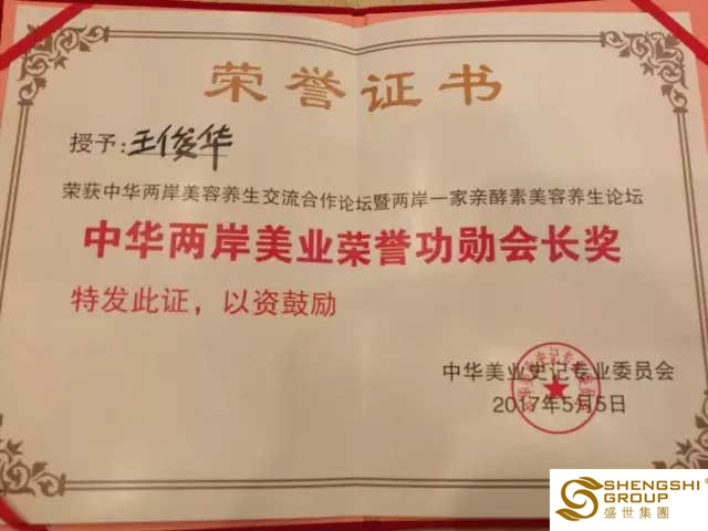 此次聚會,備受美業關注;眾多美業大咖齊聚。在美業伙伴的見證下,盛世集團董事長王俊華女士再次收獲一枚榮譽,其榮獲2017中華兩岸美容養生交流合作論壇暨兩岸一家親酵素美容養生論壇頒發的中華兩岸美業榮譽功勛會長獎。